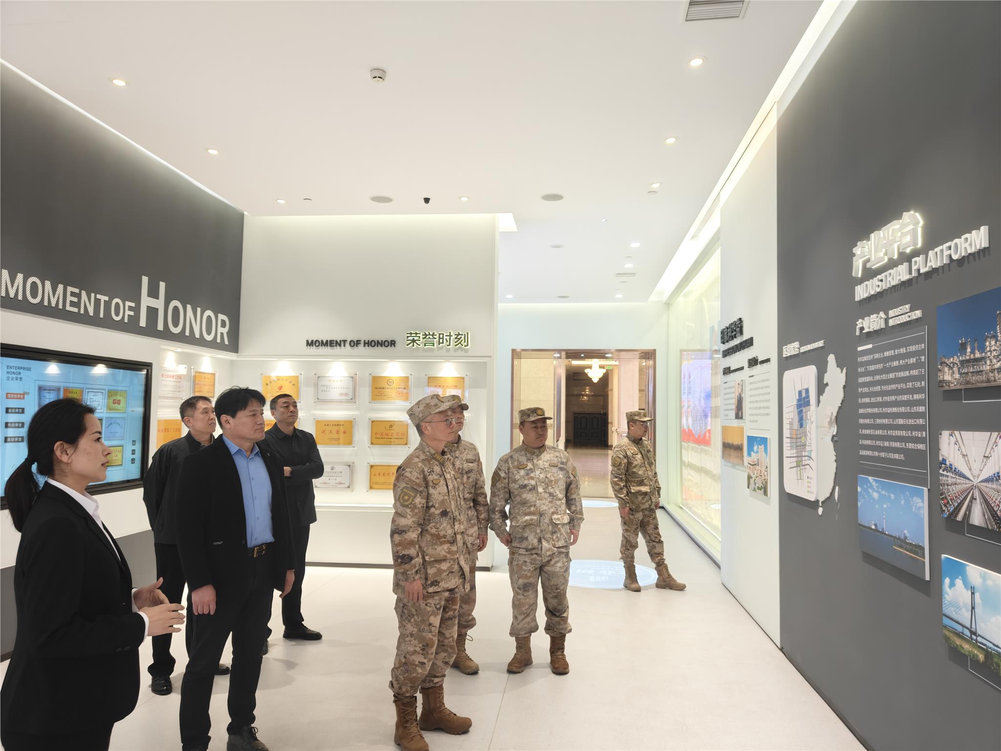 4月8日,东营军分区政委李东旗来集团调研利华益集团民兵编建情况,县委常委、县人武部部长李有,县人武部政委孙文骥,集团副总经理张淑清陪同。